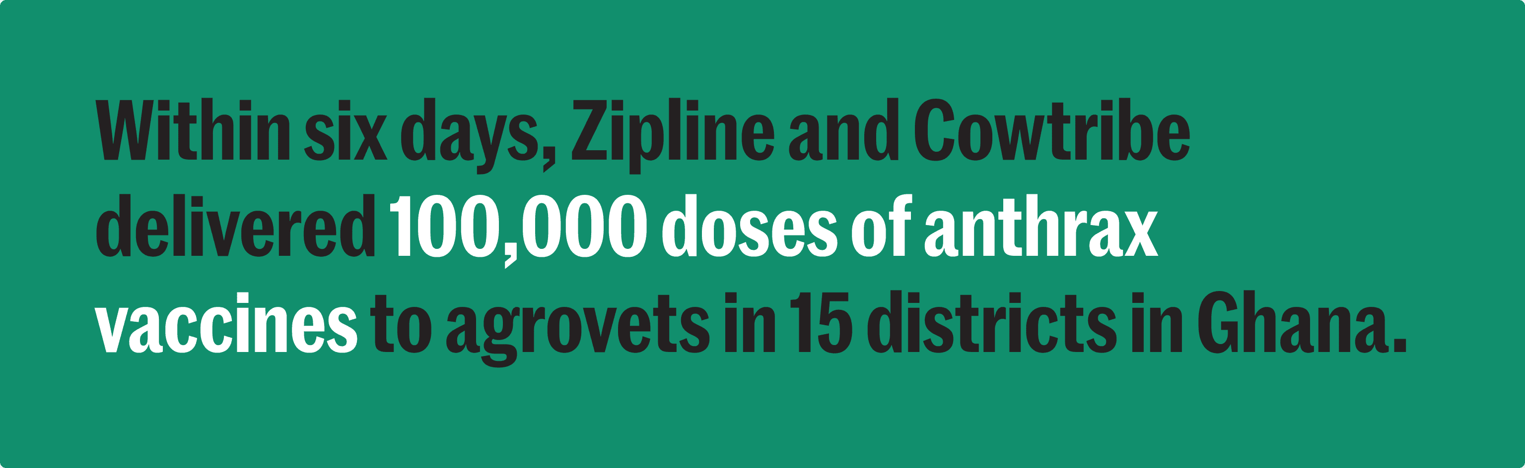 Within six days, Zipline and Cowtribe delivered 100,000 doses of anthrax vaccines to agrovets in 15 districts in Ghana. Those agrovets used the doses to vaccinate cattle, protecting livestock—a crucial economic resource for local farmers—and preventing the spread of zoonotic diseases. The coordinated approach between Zipline, veterinary professionals, and public officials contained the outbreak within the month.