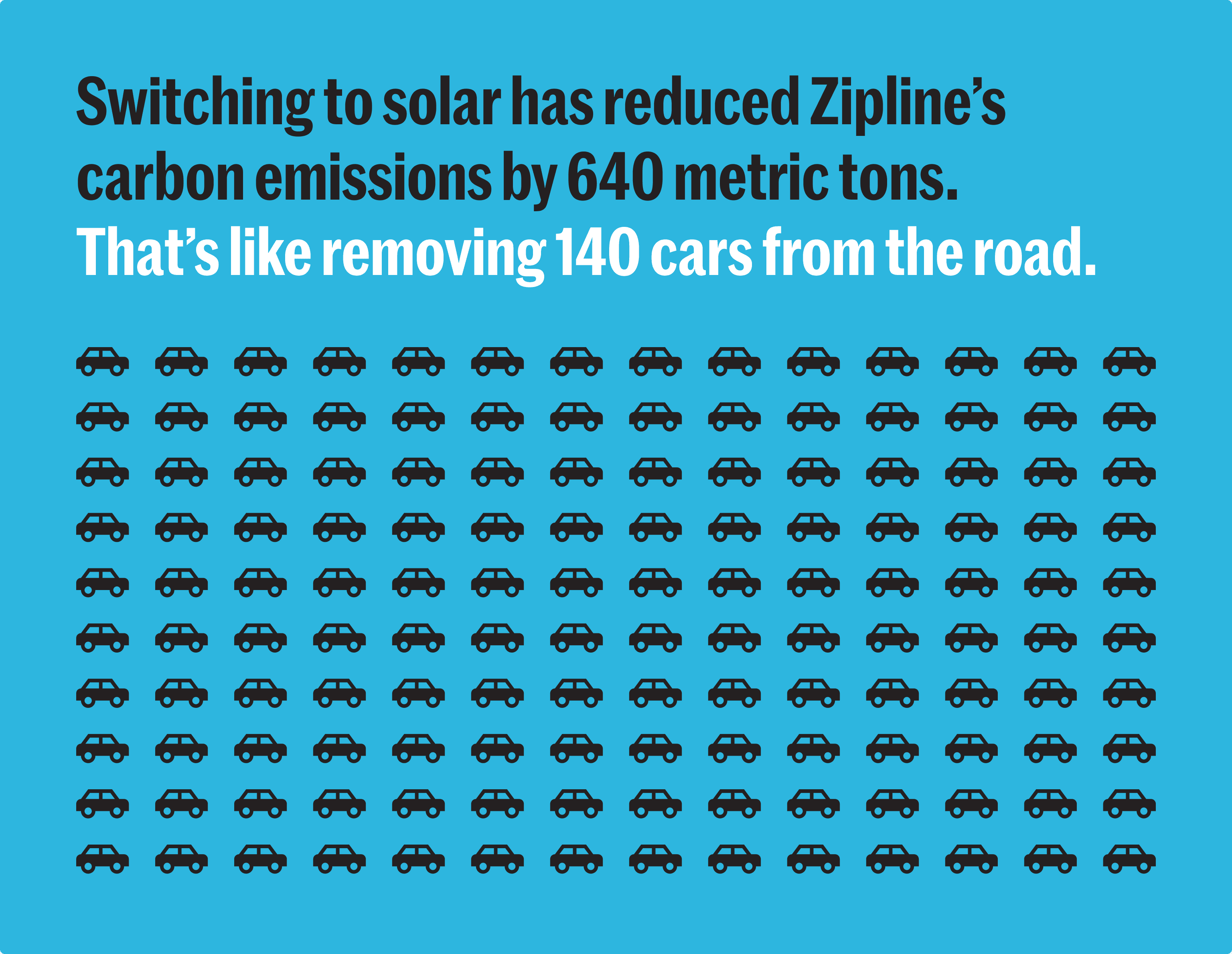 Switching to solar has eliminated the 20,000 liters of diesel per-month that Zipline was burning to power its sites at Kaduna and Cross River, reducing Zipline’s annual carbon footprint there by more than 640 metric tons of CO2—the equivalent of removing about 140 passenger cars from the road.