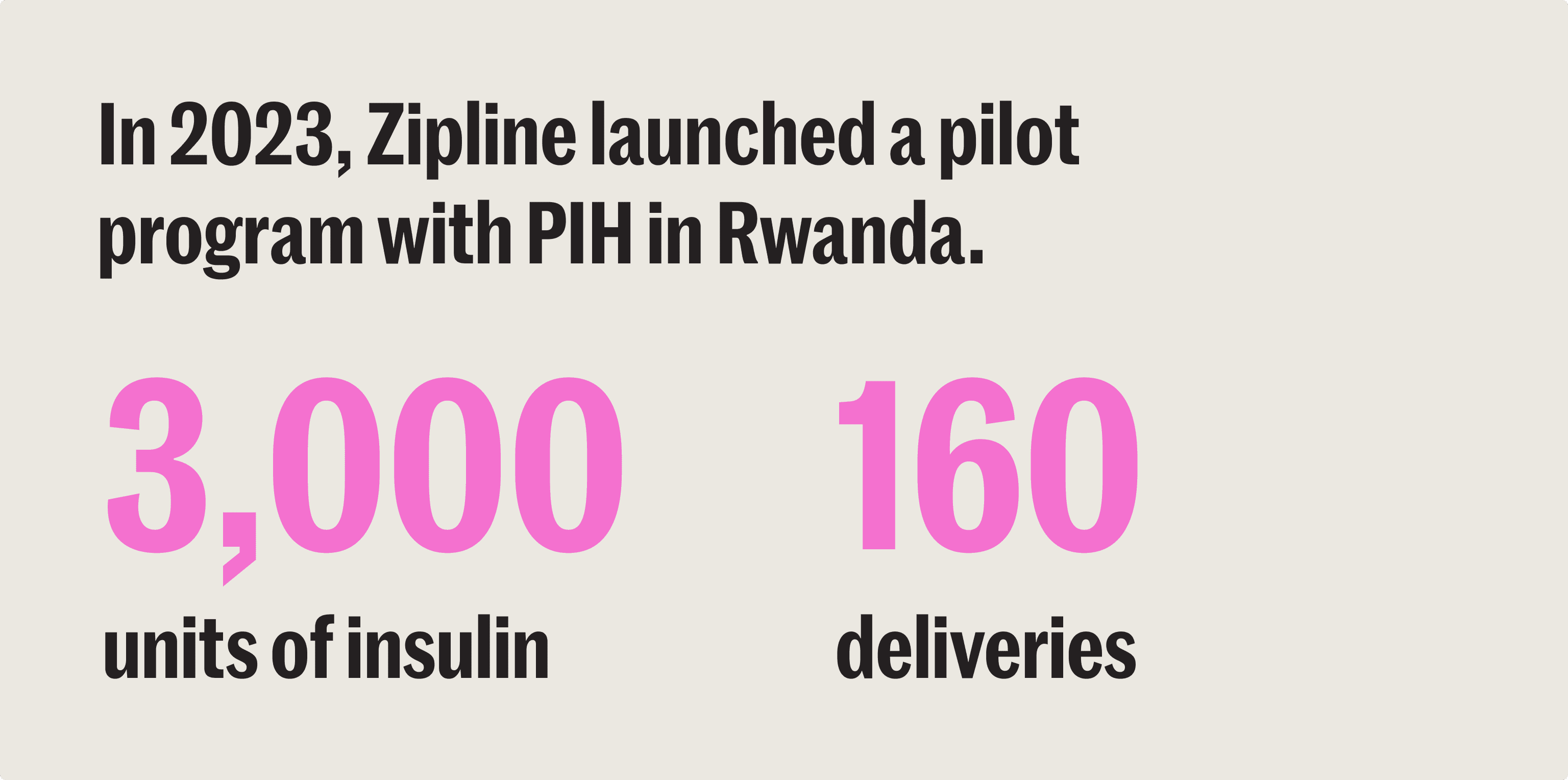 On January 20, 2023, Zipline and Inshuti Mu Buzima, as Partners in Health (PIH) is known in Rwanda, launched a pilot program to deliver insulin and other supplies directly to patients with diabetes.