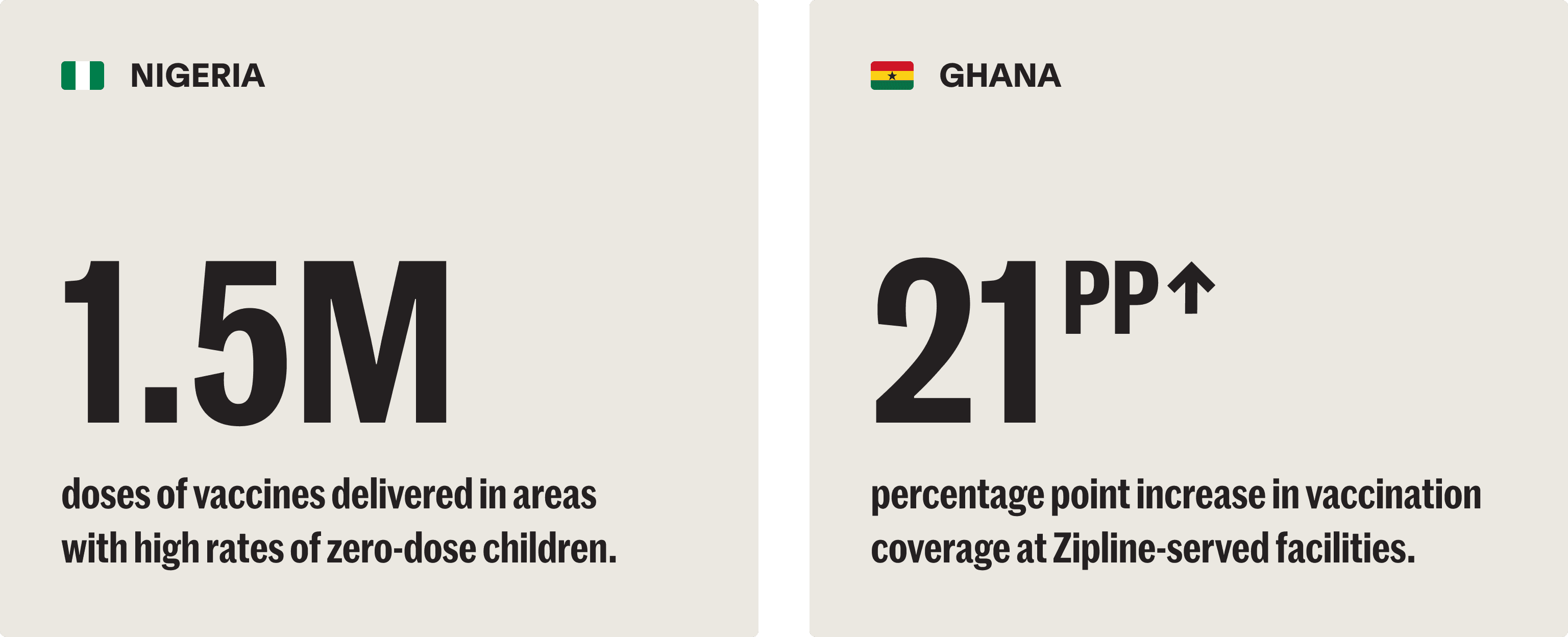 Based on Ghana’s success, Zipline has launched vaccination programs in Nigeria in partnership with Gavi and the UPS Foundation. Since launching in Nigeria in 2022, Zipline has delivered more than 1.5 million doses of routine vaccines, the majority of which have gone to children who otherwise never would have been vaccinated.