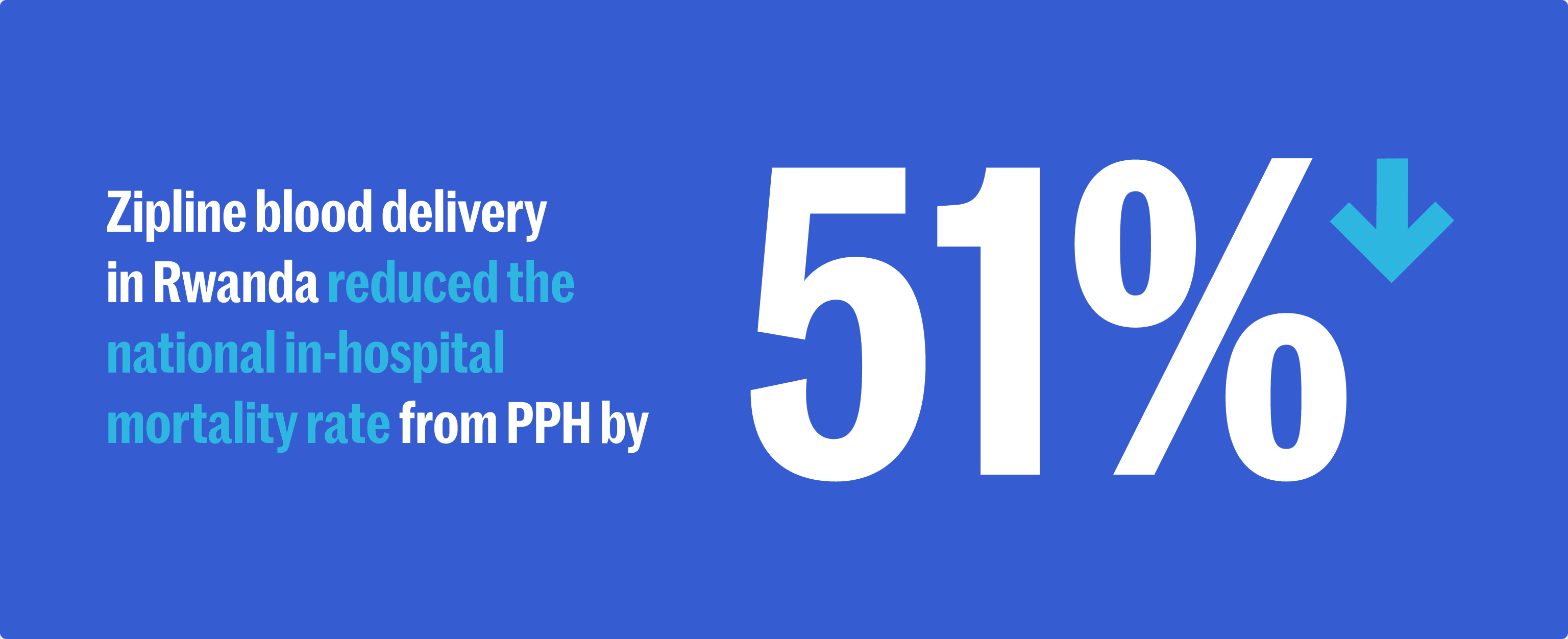 By simply improving blood delivery logistics, Zipline and the Ministry of Health in Rwanda significantly reduced the risk of maternal mortality in the country. A 2023 study published by researchers at the Wharton School at the University of Pennsylvania in collaboration with the MOH determined that Zipline blood delivery reduced nationwide in-hospital mortality from PPH by 51%.5