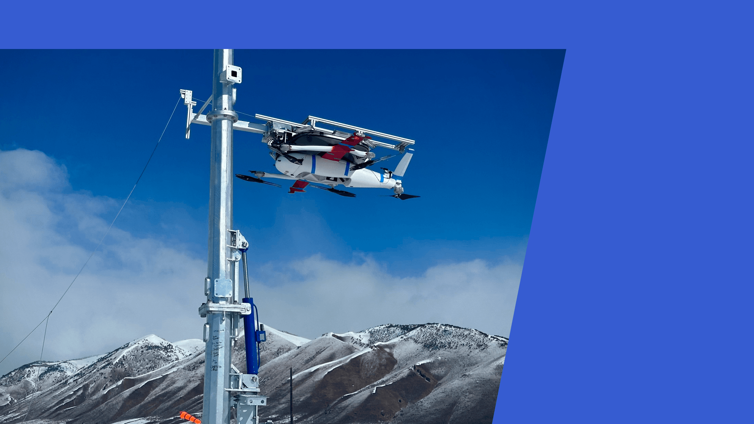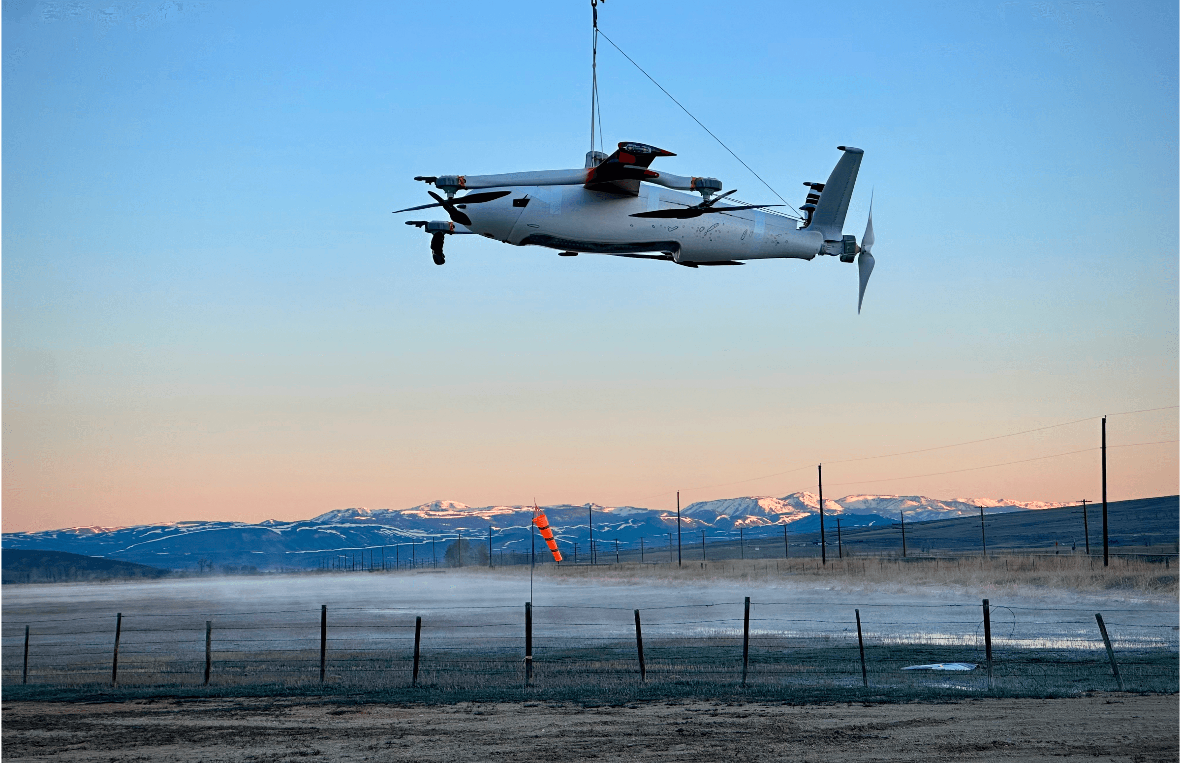 Zipline's P2 drone against the backdrop of a mountain range in Wyoming.